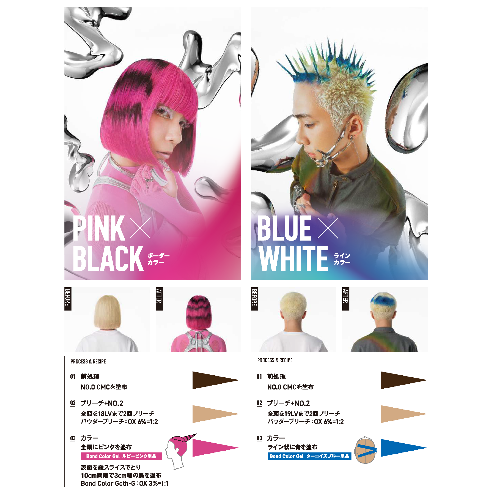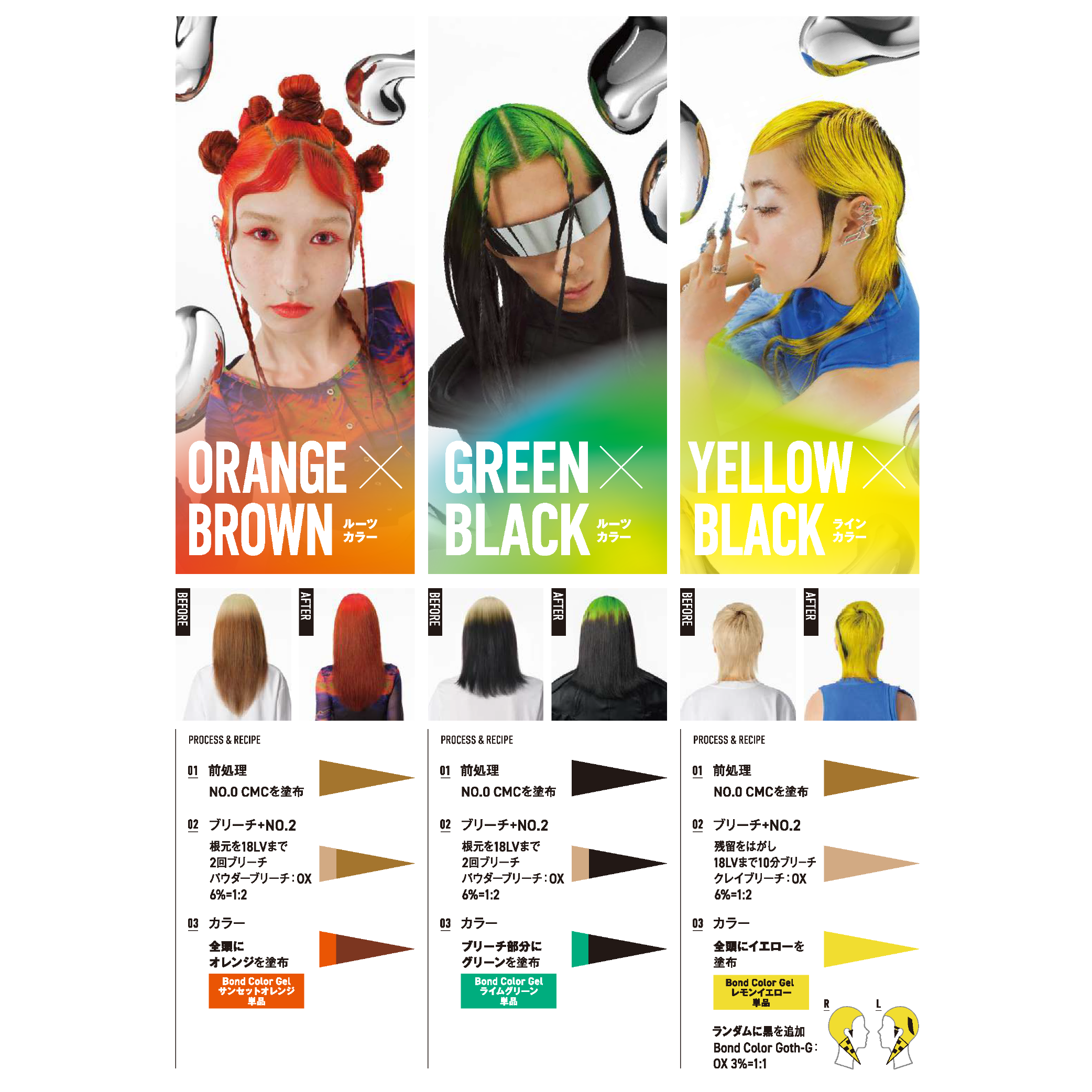 ブリーチベースに最適な発色になるよう、クリアでシンプルな染料の組み合わせで、褪色過程も色味を長く楽しめるように色相が変化しにくく、それぞれの色の特徴を持ったまま色味が褪色。