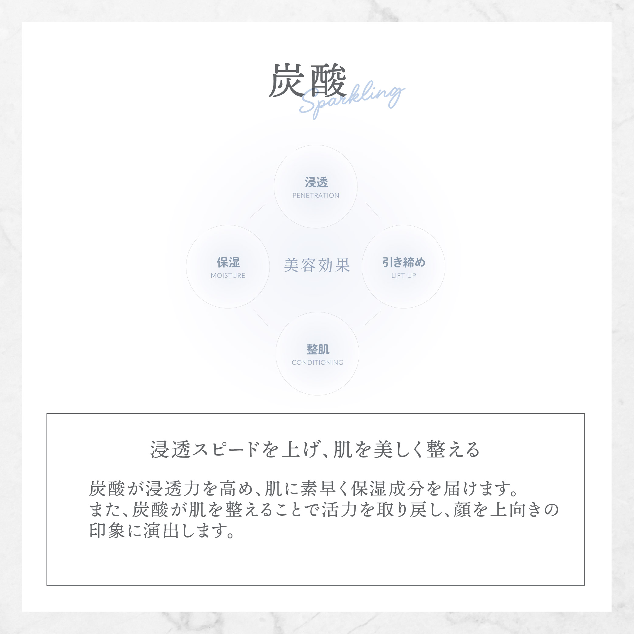 「炭酸」と「ナノバブル」効果により、超微細なミストが化粧したままの肌にも浸透し、潤いに満ちた美しく呼吸する肌をつくります。