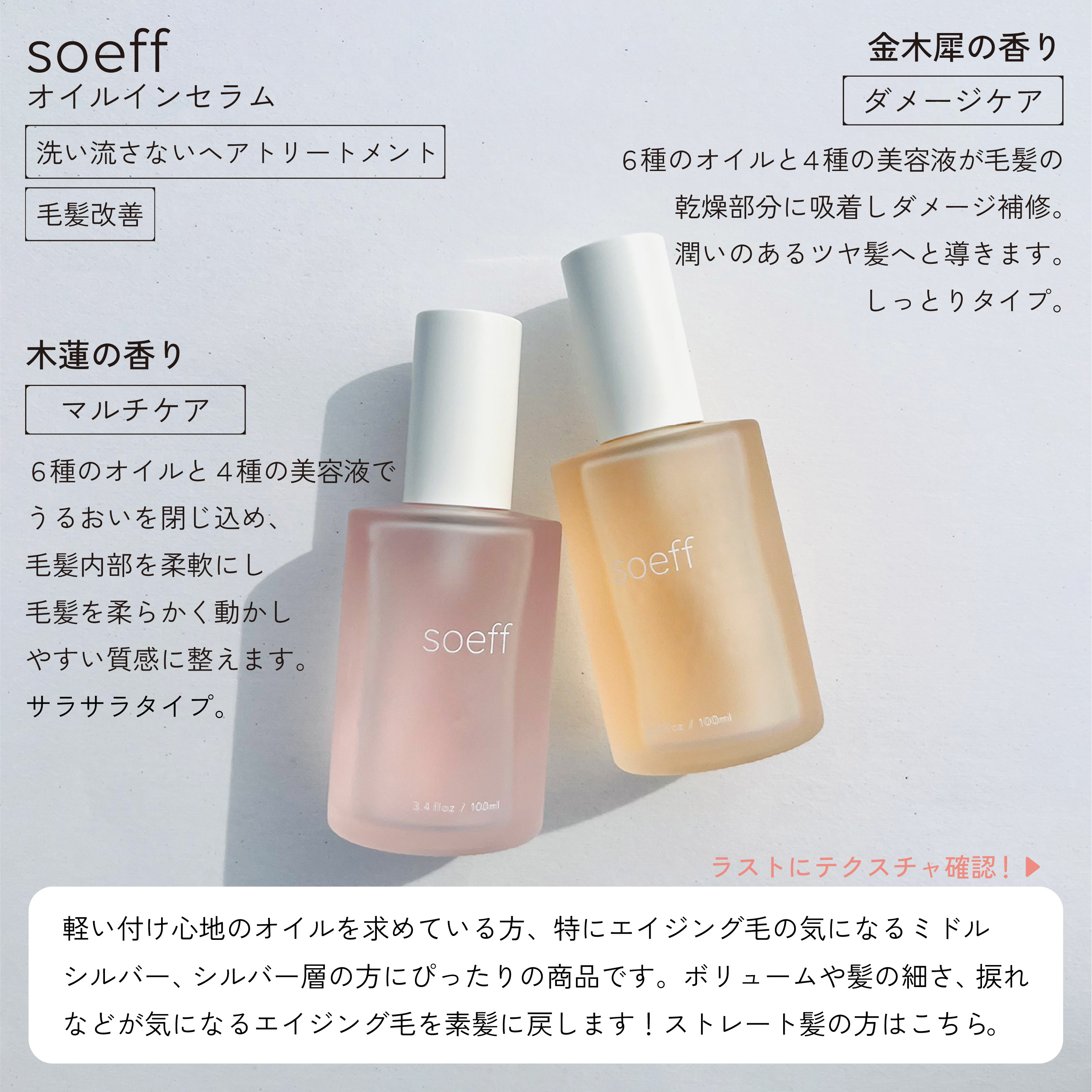 オイルの層と美容液の層に別れたsoeff独自の2層のバランス製法により、うるおいを閉じ込め、毛髪内部を柔軟にし、毛髪を柔らかく動かしやすい質感に整えます。