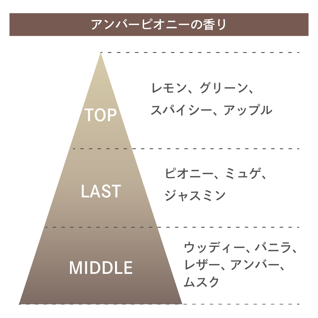 優美なピオニーにジャスミンやローズが溶け込む気品に満ちた香り。