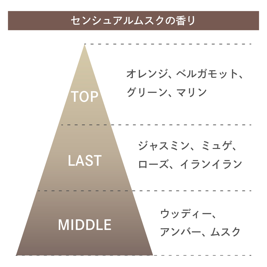 爽やかなシトラスとジャスミン、ミュゲなどの花々をムスクで包み込んだ官能的な香り。