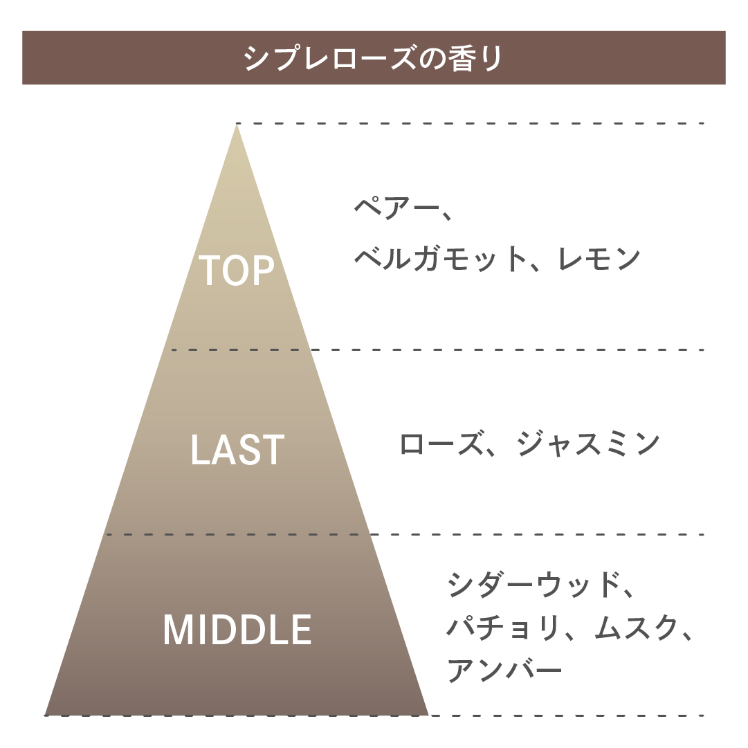 清らかなローズに果実が彩りを添え、シダーウッド、パチョリへと続く奥行きのある香り。