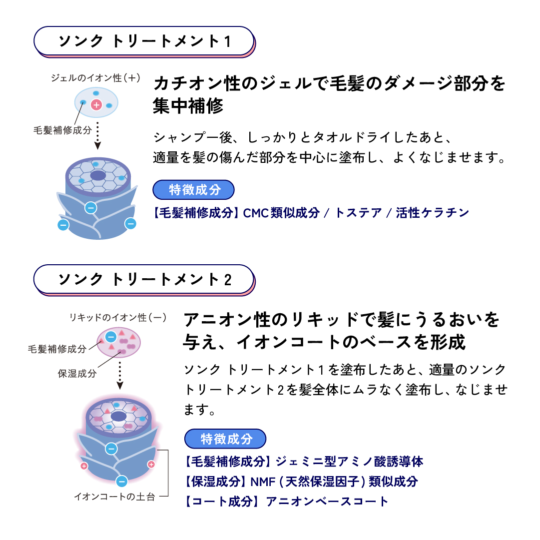 イオン性の異なるトリートメントが互いに作用し、毛髪に効率よく吸着