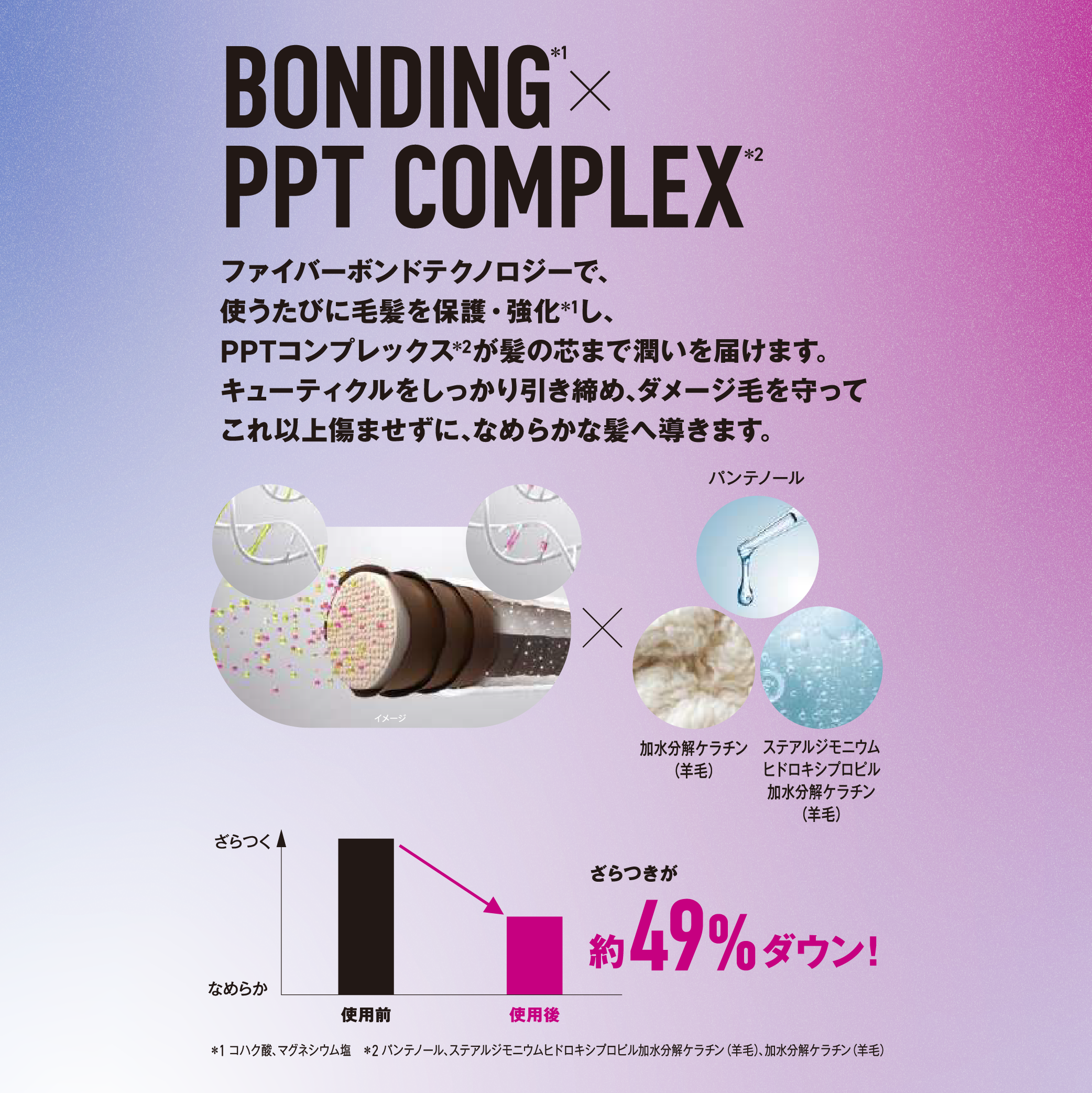 ファイバーボンドテクノロジーで、使うたびに毛髪を保護・強化*¹し、PPTコンプレックス*²が髪の芯まで潤いを届けます。