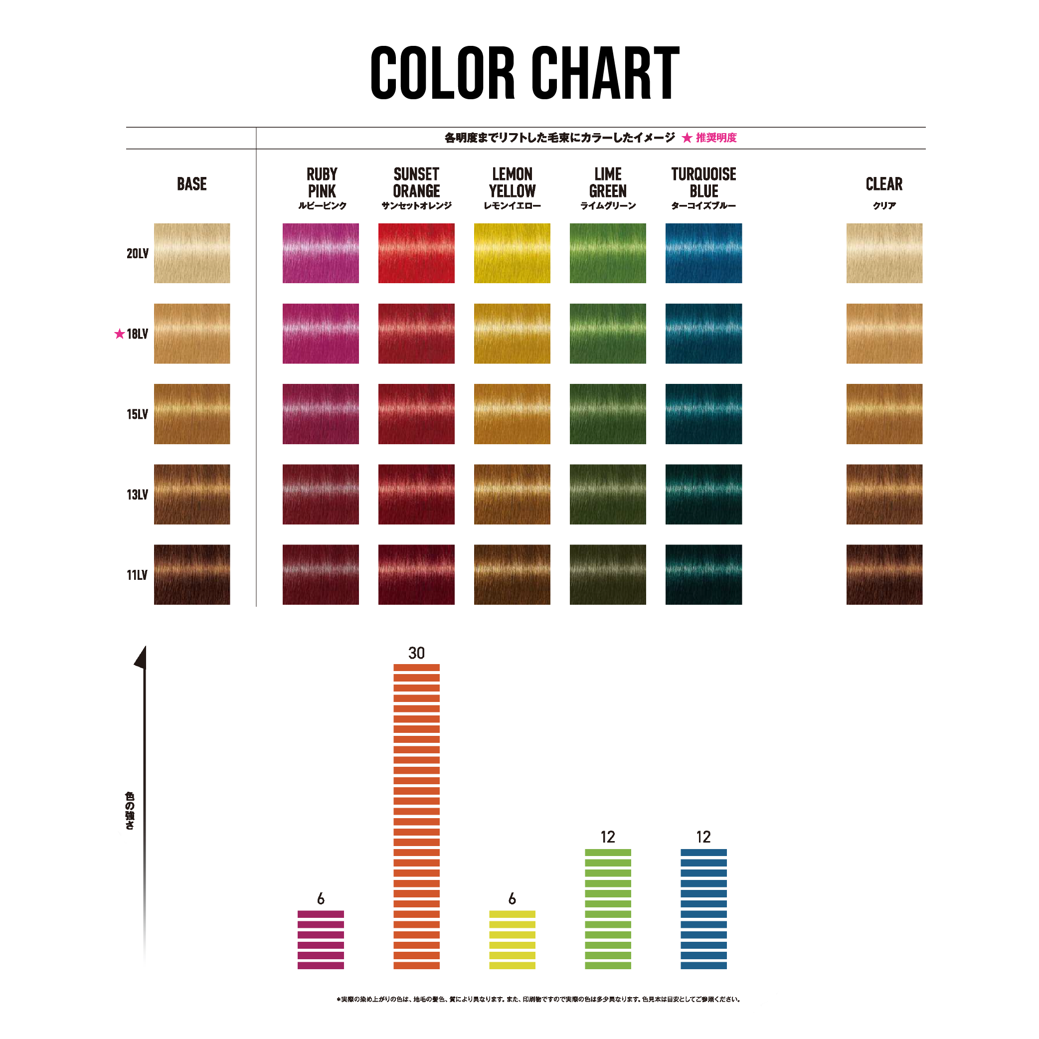 ブリーチベースに最適な発色になるよう、クリアでシンプルな染料の組み合わせで、褪色過程も色味を長く楽しめるように色相が変化しにくく、それぞれの色の特徴を持ったまま色味が褪色。